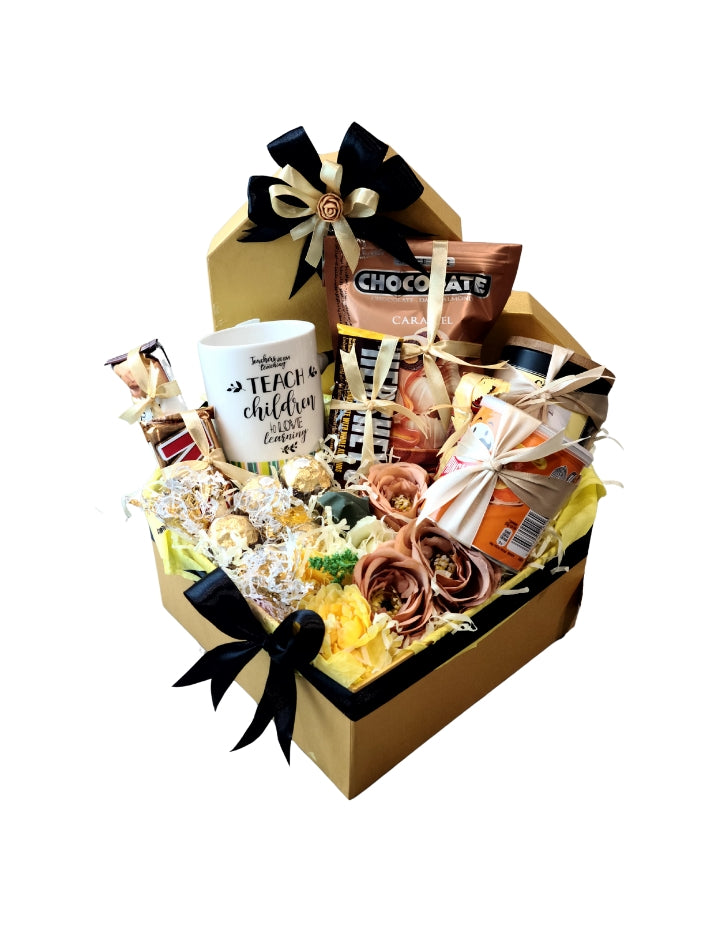A charming blend of elegance and warmth, the Golden Bloom Delight Gift Box is thoughtfully curated to express appreciation and joy. Featuring premium chocolates, a heartfelt ceramic mug, beautifully crafted artificial flowers, and luxurious packaging with black and gold accents it's the perfect gesture to make someone feel truly special.