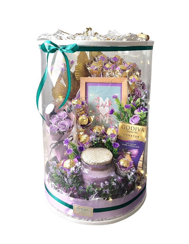 Celebrate Mom with elegance and charm! This beautifully curated gift box features luxurious lavender-toned florals, premium chocolates, a scented candle, and heartfelt accents — all encased in a clear acrylic dome. Perfect for making Mother's Day unforgettable.